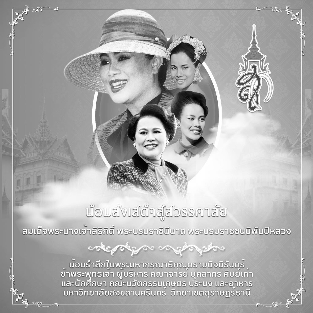 มหาวิทยาลัยสงขลานครินทร์ น้อมรำลึกในพระมหากรุณาธิคุณอันหาที่สุดมิได้สมเด็จพระนางเจ้าสิริกิติ์ พระบรมราชินีนาถ พระบรมราชชนนีพันปีหลวงข้าพระพุทธเจ้า คณะผู้บริหาร คณาจารย์ บุคลากร นักศึกษาและศิษย์เก่าคณะนวัตกรรมการเกษตร ประมง และอาหาร มหาวิทยาลัยสงขลานครินทร์