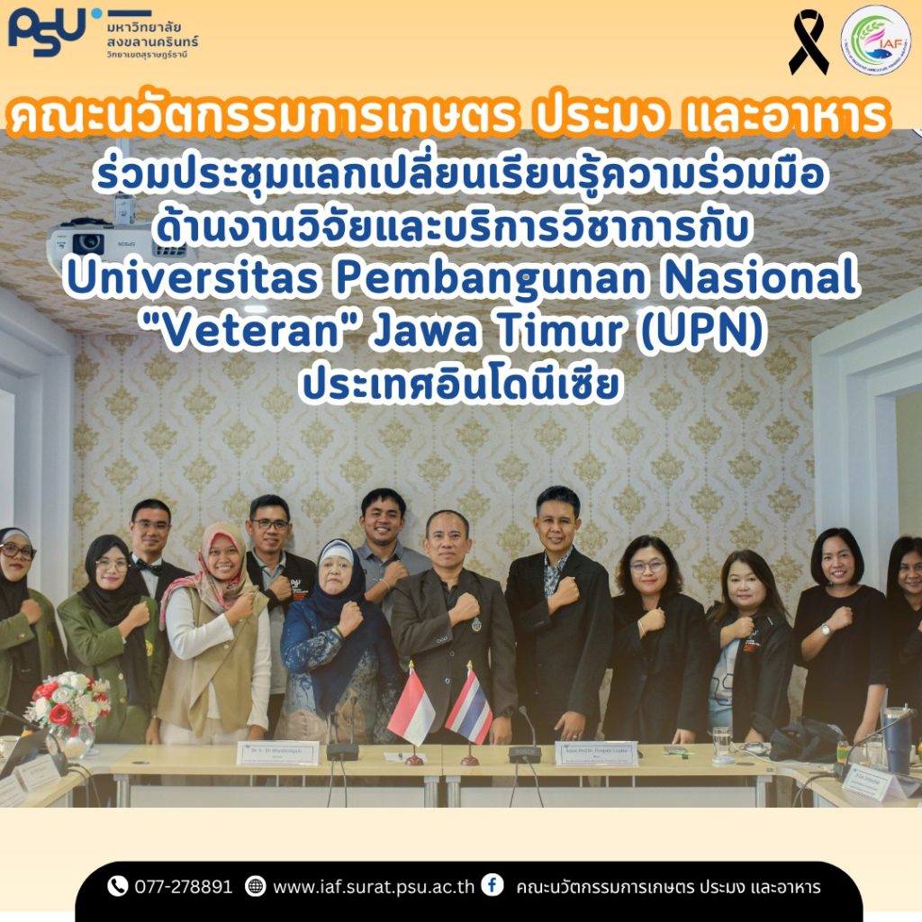 คณะนวัตกรรมการเกษตร ประมง และอาหาร มหาวิทยาลัยสงขลานครินทร์ วิทยาเขตสุราษฎร์ธานี นำโดย รองศาสตราจารย์ ดร.พงศ์ศักดิ์ เหล่าดี รักษาการแทนคณบดีคณะนวัตกรรมการเกษตร ประมง และอาหาร พร้อมด้วยคณาจารย์จากคณะฯ ได้เข้าร่วม การประชุมแลกเปลี่ยนเรียนรู้และหารือความร่วมมือด้านงานวิจัยและบริการวิชาการ กับ Universitas Pembangunan Nasional “Veteran” […]