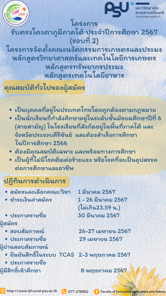 โครงการมุ่งมั่นสู่สงขลานครินทร์ เปิดรับสมัครตั้งแต่วันที่ 17 กันยายน – 15 ตุลาคม 2564 สมัครได้ที่ http://app.surat.psu.ac.th/applicant/ #วิทยาศาสตร์และเทคโนโลยีการเกษตร #เทคโนโลยีอาหาร #ทรัพยากรประมง โครงการจัดตั้งคณะนวัตกรรมการเกษตรและประมง มหาวิทยาลัยสงขลานครินทร์ วิทยาเขตสุราษฎร์ธานี
