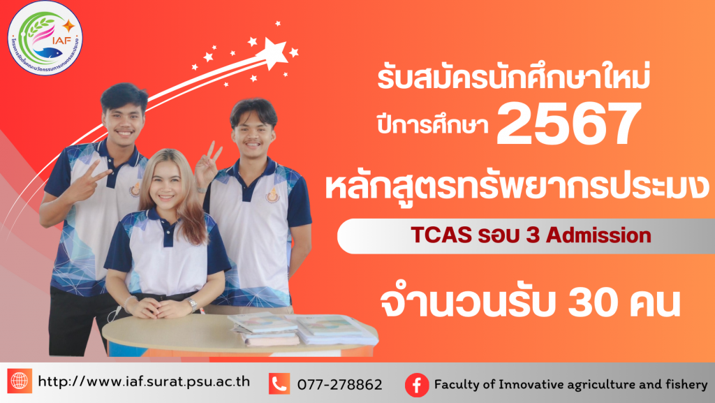 โครงการการคัดเลือกบุคคลเข้าศึกษาระดับปริญญาตรี สมัครออนไลน์ได้ที่ https://student.mytcas.com/ หลักสูตรทรัพยากรประมง รับ 30 คน